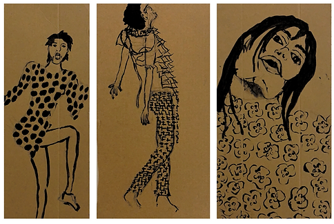 (The bottom row) On the left is sketches of original silhouette ideas. In the middle is a picture of fabric painted with ink that was originally going to be used. Photograph on the right shows the process of trying to create the look on the body.