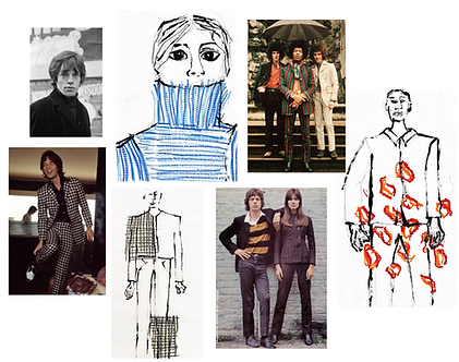 On the left, exploring my illustration style taking influences from male musicians. Using coloured oil pastels and ink.