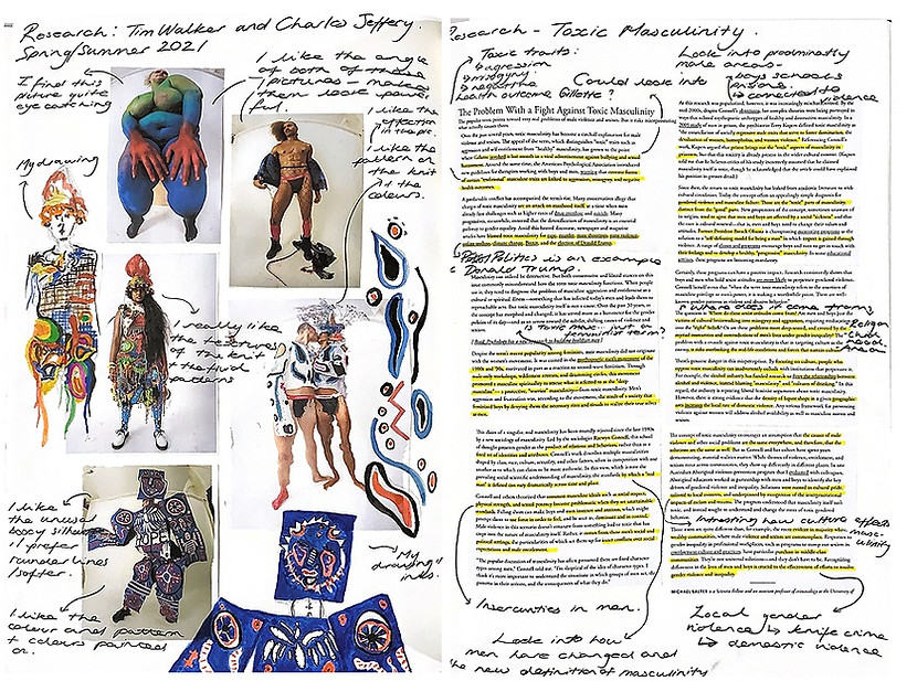 (Two single sketchbook pages) On the left is research on Charles Jeffery's spring/summer 2021 collection photographed by Tim Walker, focusing on the textures of the knits and the prints. On the right is an article I analysed from ‘The Atlantic’ about the problems with toxic masculinity and how it effects society. (FAD 2020)