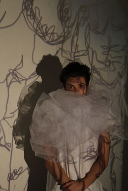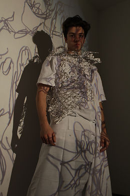 These three photographs were taken as an experiment. Influenced by the work of Charles Jeffery and Tim Walker and research into toxic masculinity. I wanted to explore the male figure using a range of fabrics to play with silhouettes, draping, texture and volume and project my sketches of different body parts on to them. I found it interesting to see how each look presents masculinity differently .